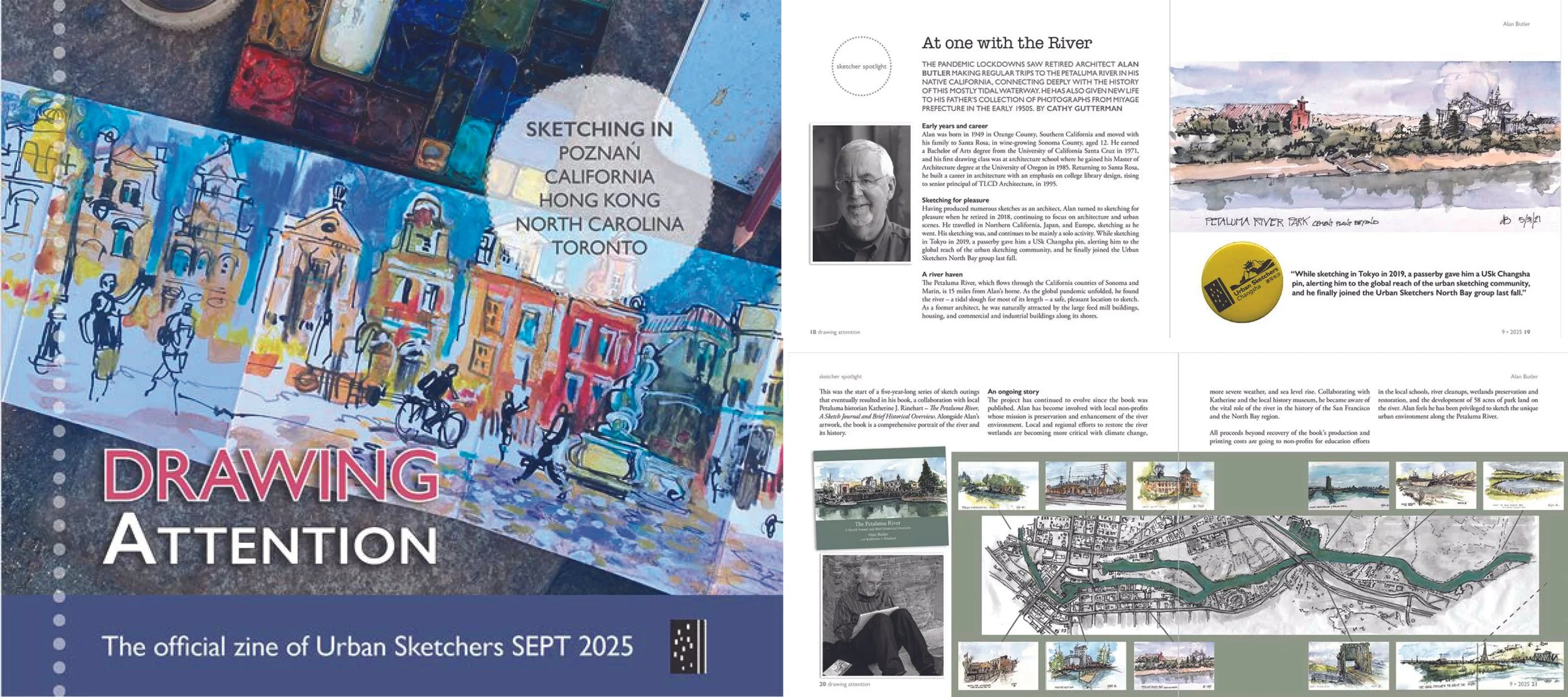 I am honored to be the Sketcher Spotlight in the September issue of the online magazine Drawing Attention. The “zine” is the official quarterly publication of Urban Sketchers (USk) a world-wide organization with 500 chapters in 70 countries. The Urban Sketchers-North Bay (California) has 451 members while the SF Bay Area Urban Sketchers chapter has 3,400 members. Drawing Attention has a subscribed readership of about 16,000.
